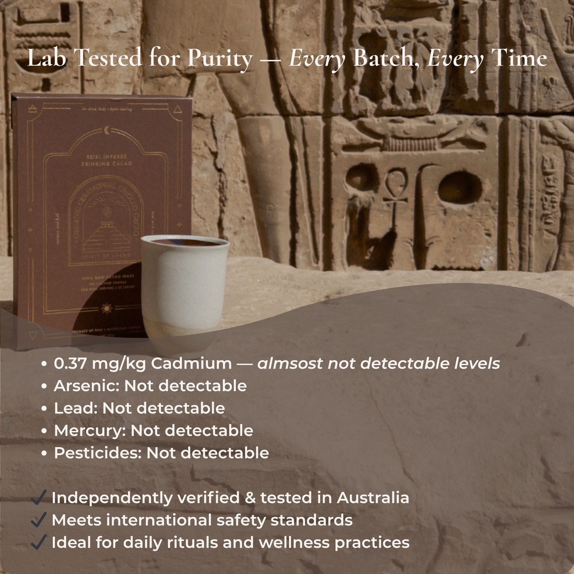 Naturally occurring essential minerals in pure cacao: supporting energy, muscle function, and daily vitality.